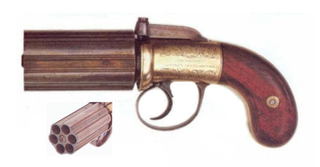 ペッパーボックスピストルは、回転式弾倉と銃身が一体化した形態のリボルバー拳銃の名称で、初期のペッパーボックスピストルは薬室と一体化した複数銃身を、鋳造して製造する方法がとられていました。鋳造の効果と、通常のリボルバー拳銃のように銃身と薬室を回転毎に精密に結合させる技術が必要ないため、内部機構も簡素化がされ安価な発射システムが大量に生産できたといわれています。