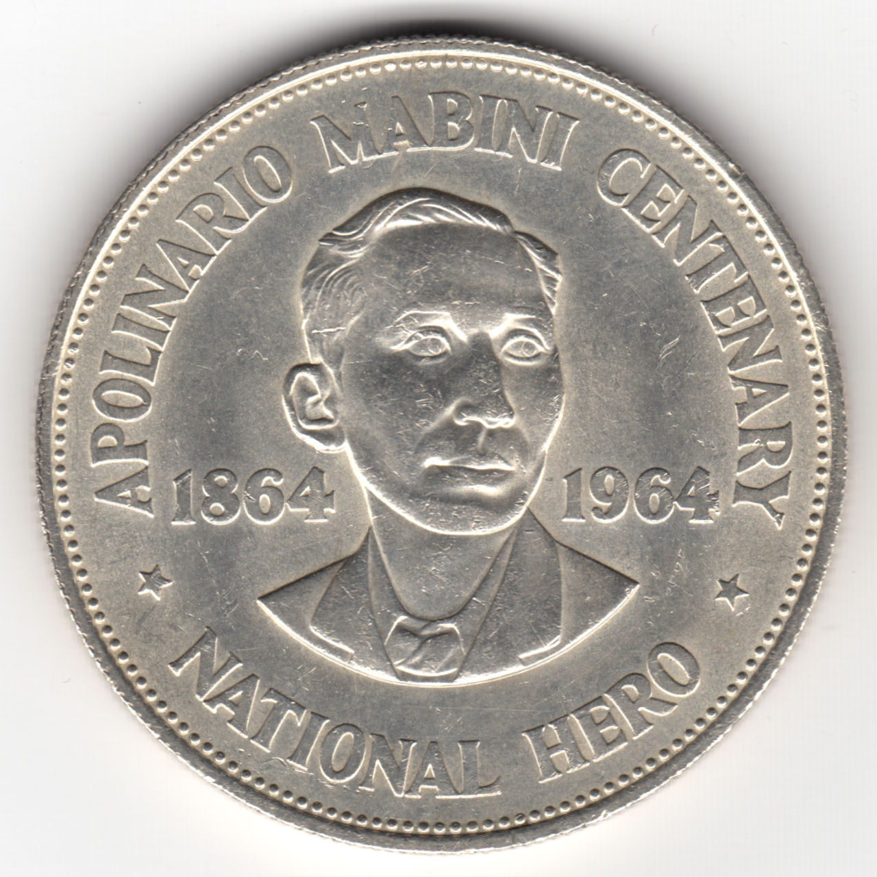 1964年にアポリナリオ・マビニ生誕100年を記念して発行。材質(Material):90%銀(Silver) ●直径(Diameter):38mm ●重量(Weight):26.6g。