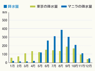 フィリピンは、高温多湿の熱帯性気候です。季節は、雨季(6〜10月)と乾季(11〜5月)に分かれ、乾季はクールドライシーズン(11〜2月)とホットドライシーズン(3〜5月)に分けられます。マニラの年間平均気温は26.7℃で、1年を通して4℃程度の気温変化があります。マニラの気温が最も高くなるのは4月で平均最高気温が33.5度まで上がり、最も涼しくなる1月には平均最低気温が23.5度になります。年間降水量は2069ミリメートルあり、雨の70%が6月から10月に集中します。