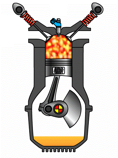 圧縮された空気は温度が上昇します。上昇した空気の中へインジェクションノズルより燃料を噴射し、着火燃焼を開始し、ピストンは上死点から下死点まで押し下げられます。