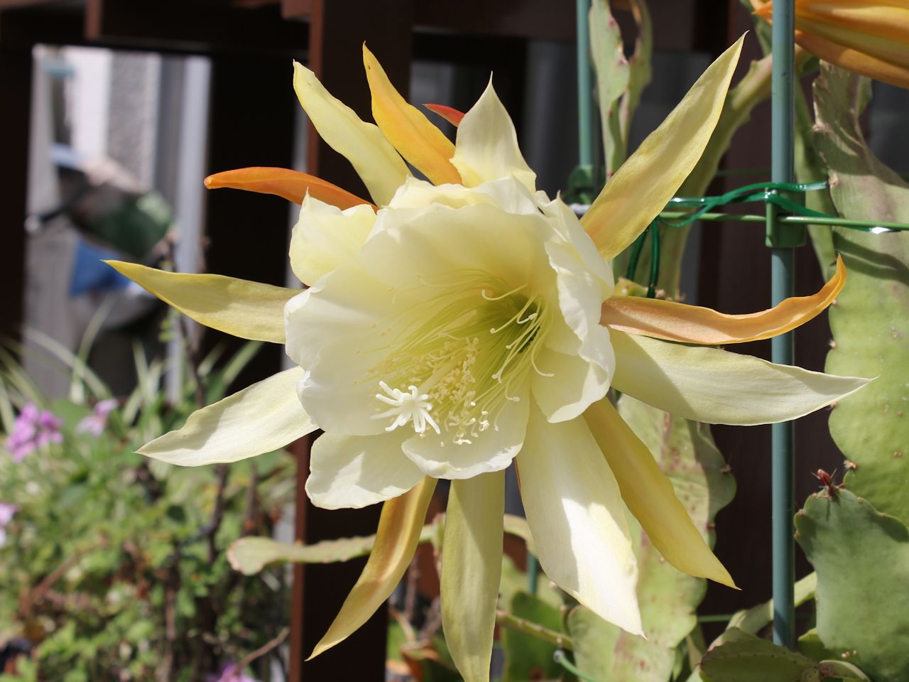 クジャクサボテン、英名はオーキッドカクタス(orchid cactus)。学名はEpiphyllum spp、メキシコ南部〜アルゼンチンを原産地とするサボテン科クジャクサボテン属の常緑多肉植物。開花の時期は5月〜6月で、草丈は50cm〜150cmになります。花の色は赤、白、黄色、橙色、紅紫色など多彩で、花は2〜3日は咲いています。香りはありません。