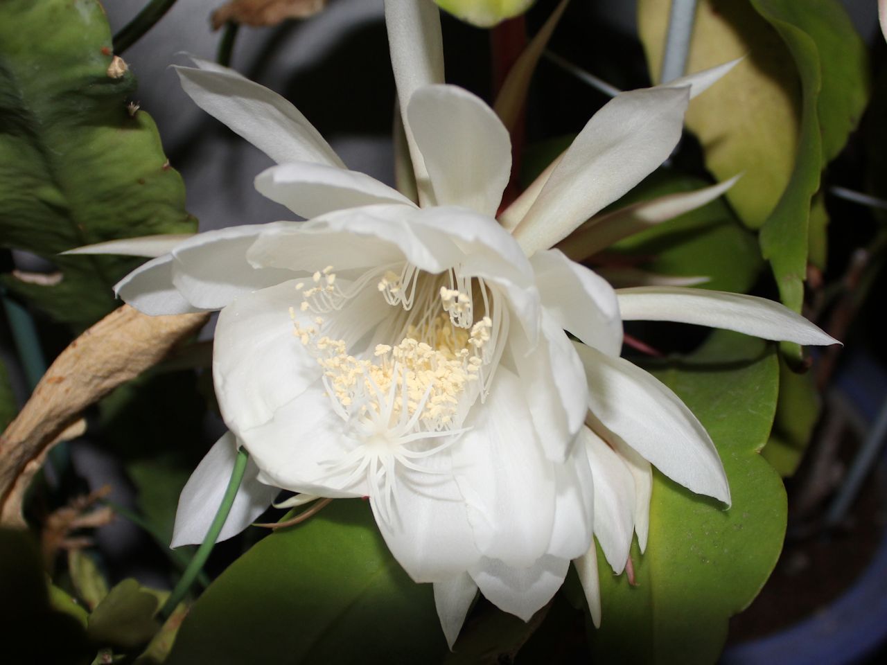 月下美人(げっかびじん)学名はEpiphyllum oxypetalum、メキシコの熱帯雨林地帯を原産地とするサボテン科クジャクサボテン属の常緑多肉植物。開花の時期は6月〜10月で、草丈は50cm〜200cmになります。夜に花を咲かせ、一晩しか花を咲かせない事で知られています。花がとても大きく純白色で花径は、約20cm〜25cmになります。育て方は、風通しがよく、直射日光に半日ぐらい当たるような所で育てます。真夏の日差しは強すぎるので、一日中日が当たる場所は避けます。湿度に弱いため長雨に当てないようにします。寒さに弱いため冬は室内に置き7度以上で育てます。水は、土が絶えず湿っている状態は根腐れを起こす原因となります。土が白く乾いてきたら水を与えます。冬は特に乾いてから1週間位後に水を与え乾燥気味に育てます。
