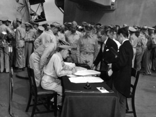 降伏文書調印式は1945年(昭和20年)9月2日に東京湾、浦賀水道内の海域に停泊する戦艦ミズーリ(USS Missouri)の甲板上で行われ、アメリカ合衆国、イギリス、フランス、オランダ、中華民国、カナダ、ソビエト、オーストラリア、ニュージーランドが調印して日本の降伏を受け入れました。 連合国側は、チェスター・ニミッツ海軍元帥、連合軍最高司令官ダグラス・マッカーサー陸軍元帥、他全ての連合国軍高官がミズーリに乗艦しました。 日本側全権代表団は外務大臣の重光葵政府全権と参謀総長の梅津美治郎大本営全権、随員は参謀本部第一部長宮崎周一陸軍中将、終戦連絡中央事務局長官岡崎勝男、軍令部第一部長富岡定俊海軍少将、内閣情報局第三部長加瀬俊一、大本営陸軍参謀永井八津次陸軍少将、海軍省出仕横山一郎海軍少将、終戦連絡中央事務局第三部長太田三郎、大本営海軍参謀柴勝男海軍大佐、大本営陸軍参謀杉田一次陸軍大佐でした。豊田副武軍令部総長は出席を拒否し、次長の大西瀧治郎中将は自決したそうです。